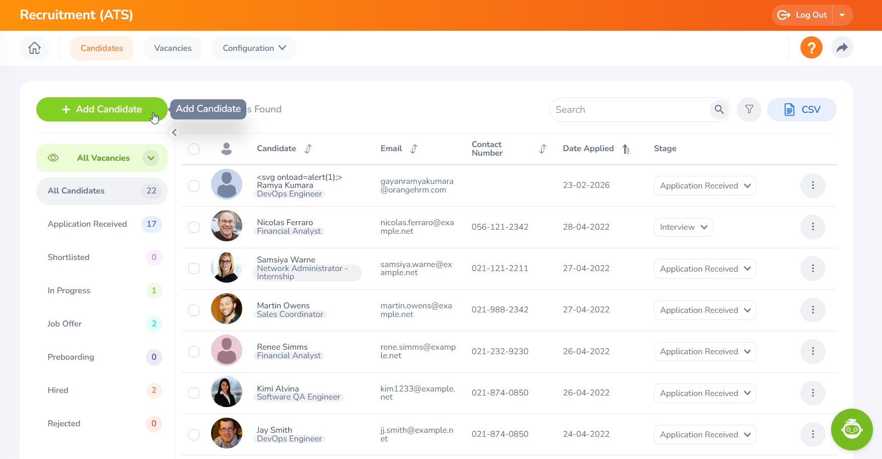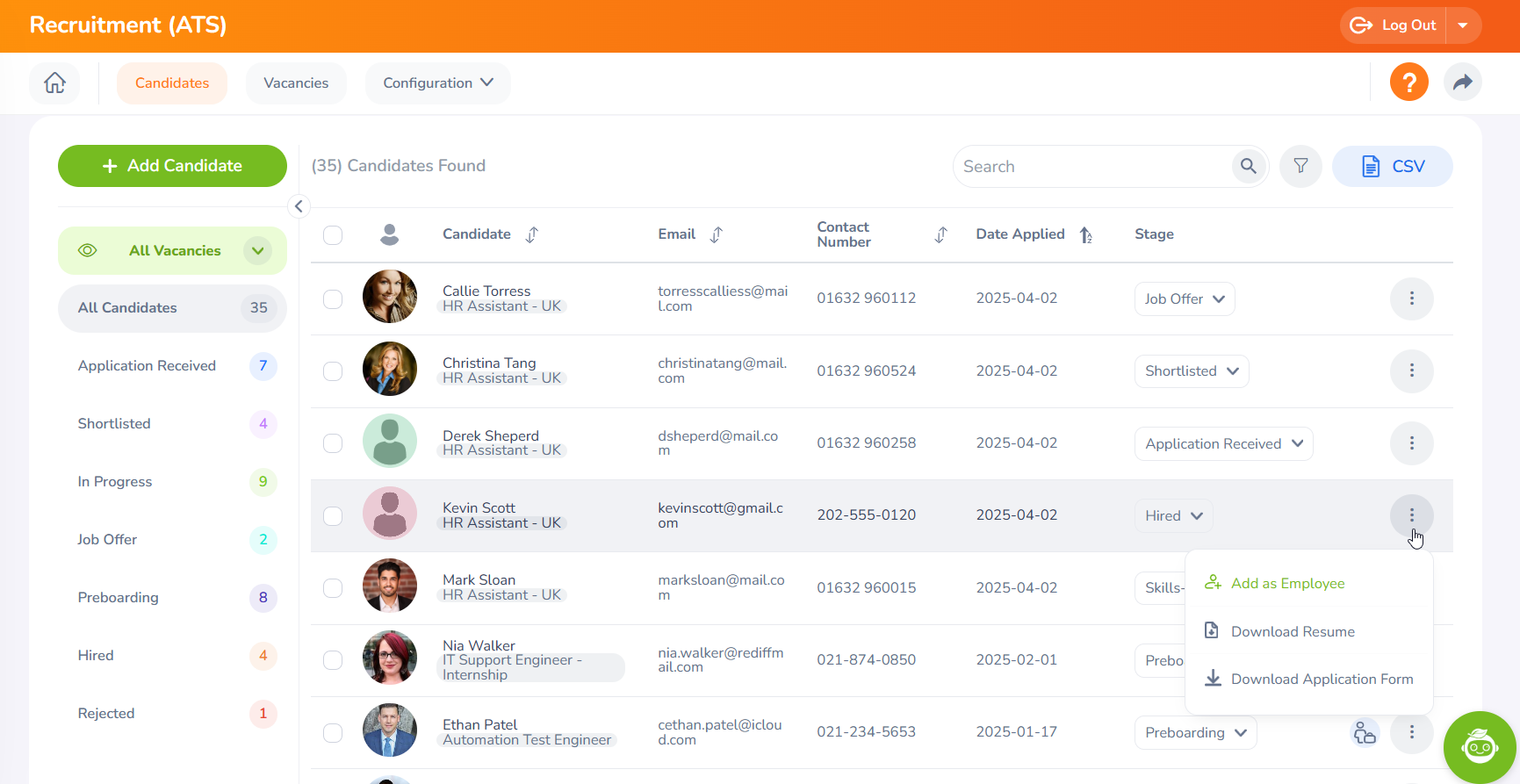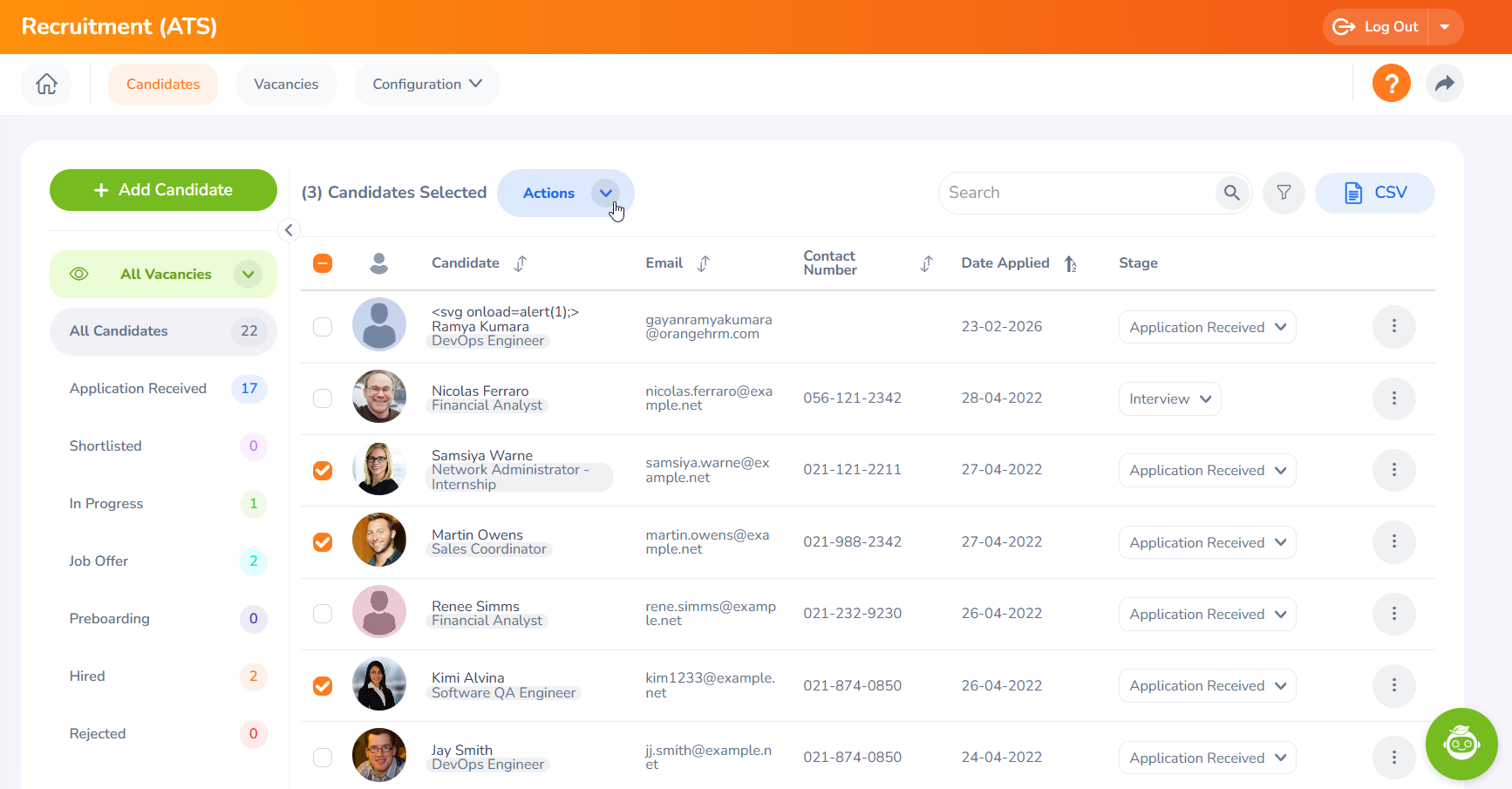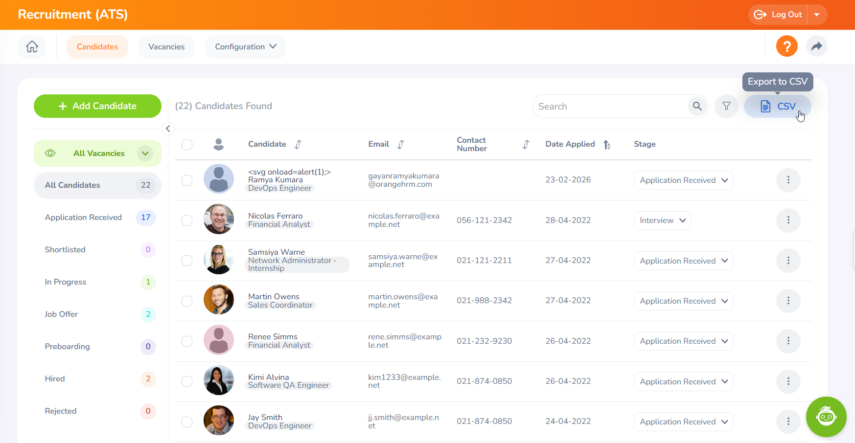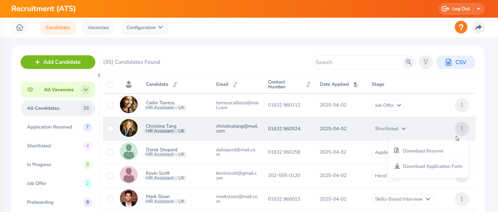 OrangeHRM allows you to download a candidate's application form as a PDF for offline access, enabling you to review candidate details without logging into the system. You can also download the candidate's resume alongside the application form. Additionally, the platform supports comparing candidates within the same recruitment stage, helping you evaluate and shortlist applicants more effectively.