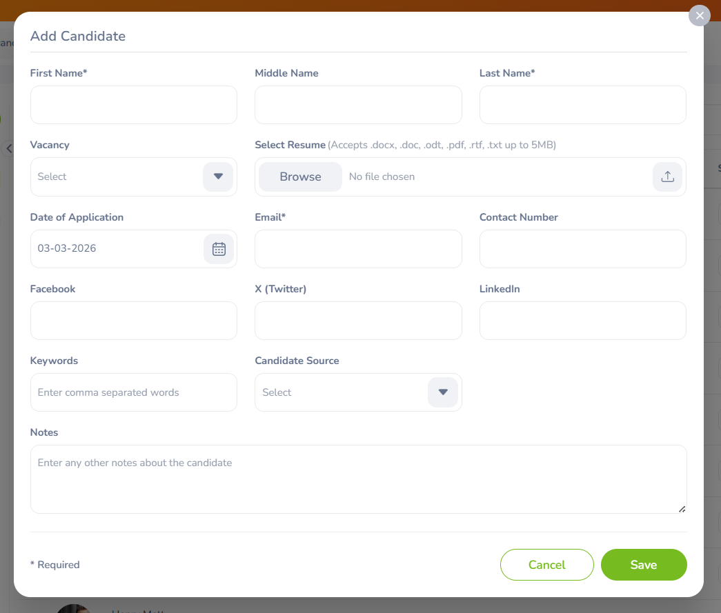| Select Resume | Upload candidate's resume (Accepted formats: .docx, .doc, .odt, .pdf, .rtf, .txt; Max size: 5MB) |