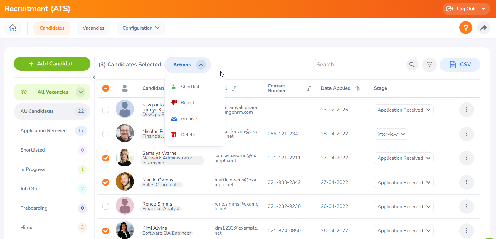 Step 1 - Browse through the list of candidates and select the ones you want to take action on. You can do this by checking the box next to each candidate’s name, allowing you to select multiple candidates at once.
