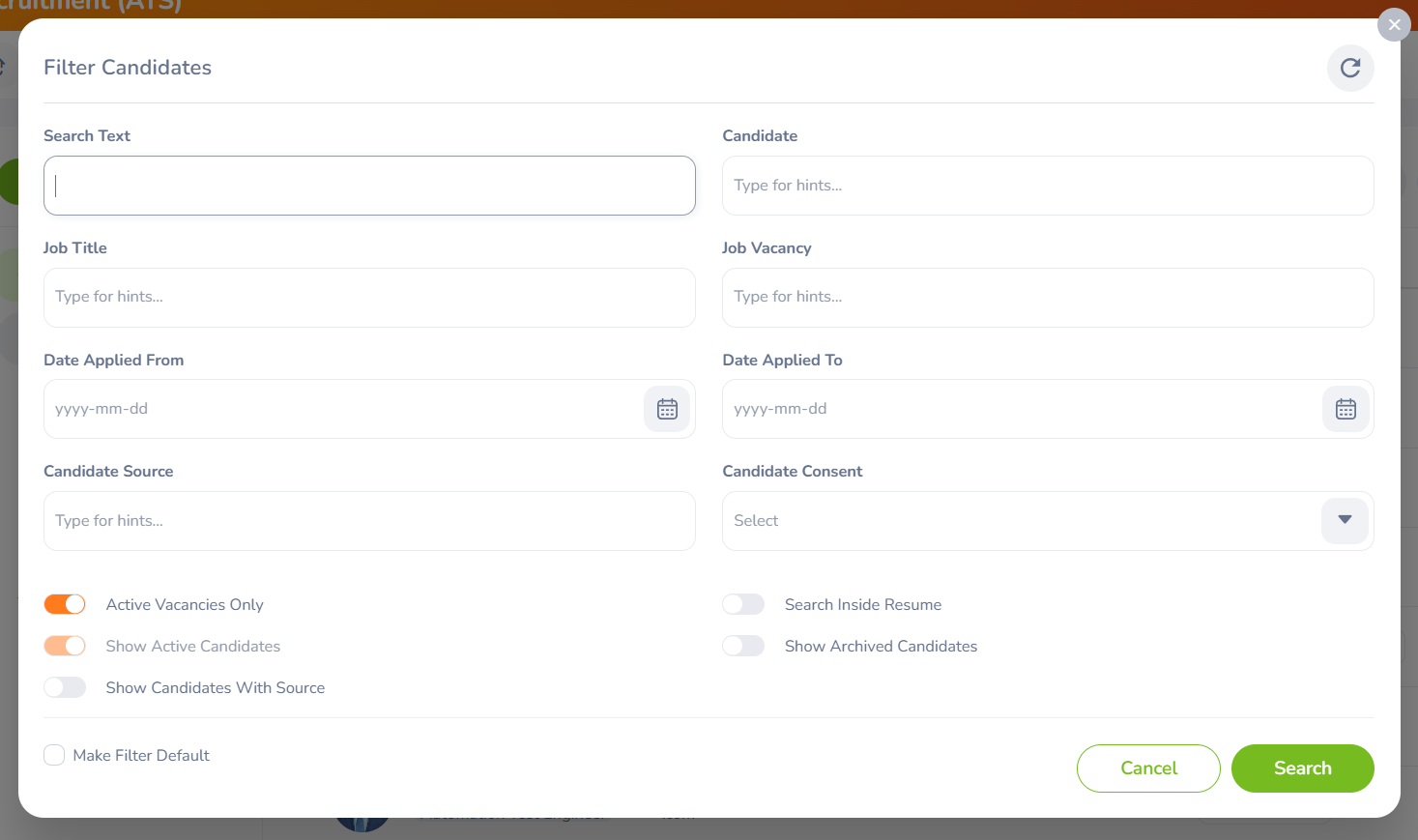 | Active Vacancies Only | Search only for candidates who have applied for open vacancies. The user needs to click the checkbox to enable this option. |