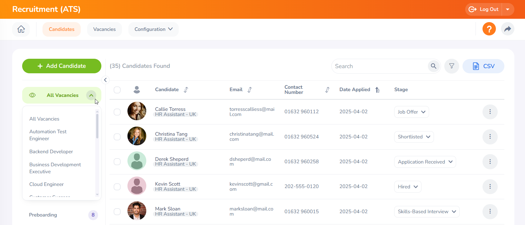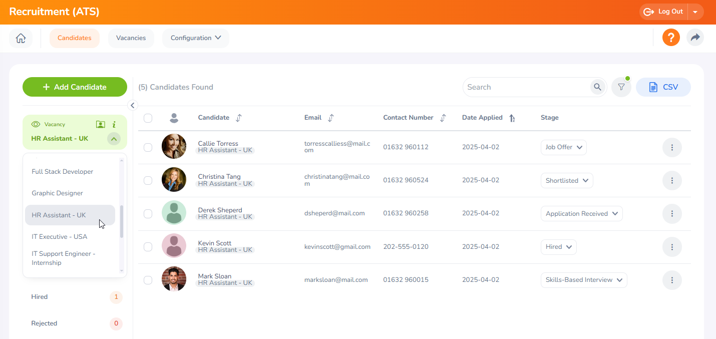Once you select a vacancy from the dropdown, the system will display a list of candidates who have applied to that specific vacancy.