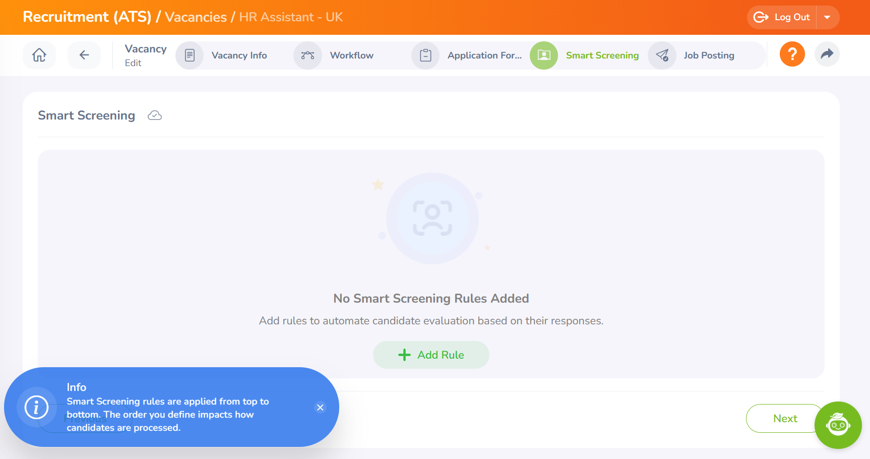 Once clicked, you will be redirected to the Smart Screening section of the Vacancy Workflow.
