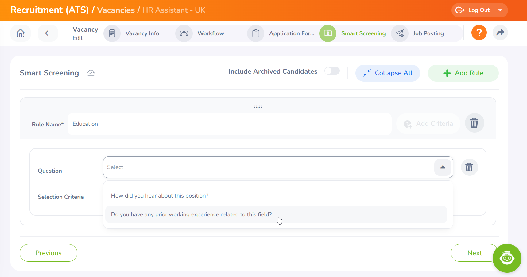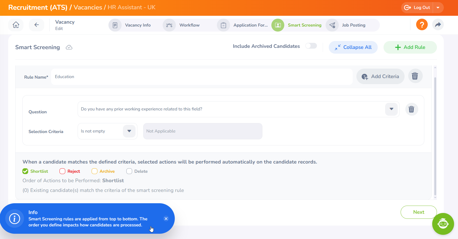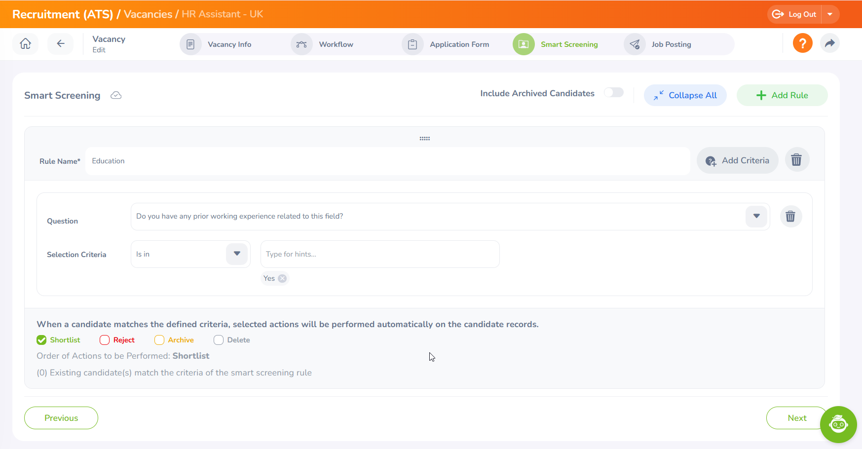 If a candidate indicates that they have prior work experience related to the vacancy, the system will automatically shortlist them according to the rules defined in the Smart Screening configuration.