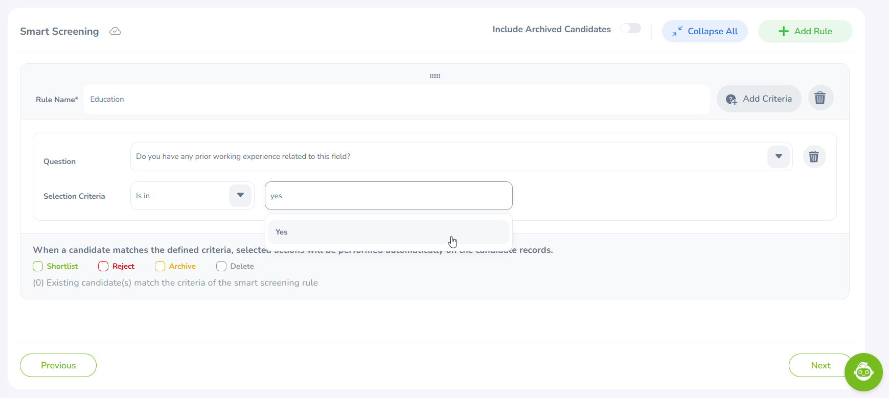 When a candidate selects "yes," the system matches the response against the defined rule and automatically updates the candidate's status to "Shortlist" helping streamline the screening process and ensuring qualified applicants are prioritized.