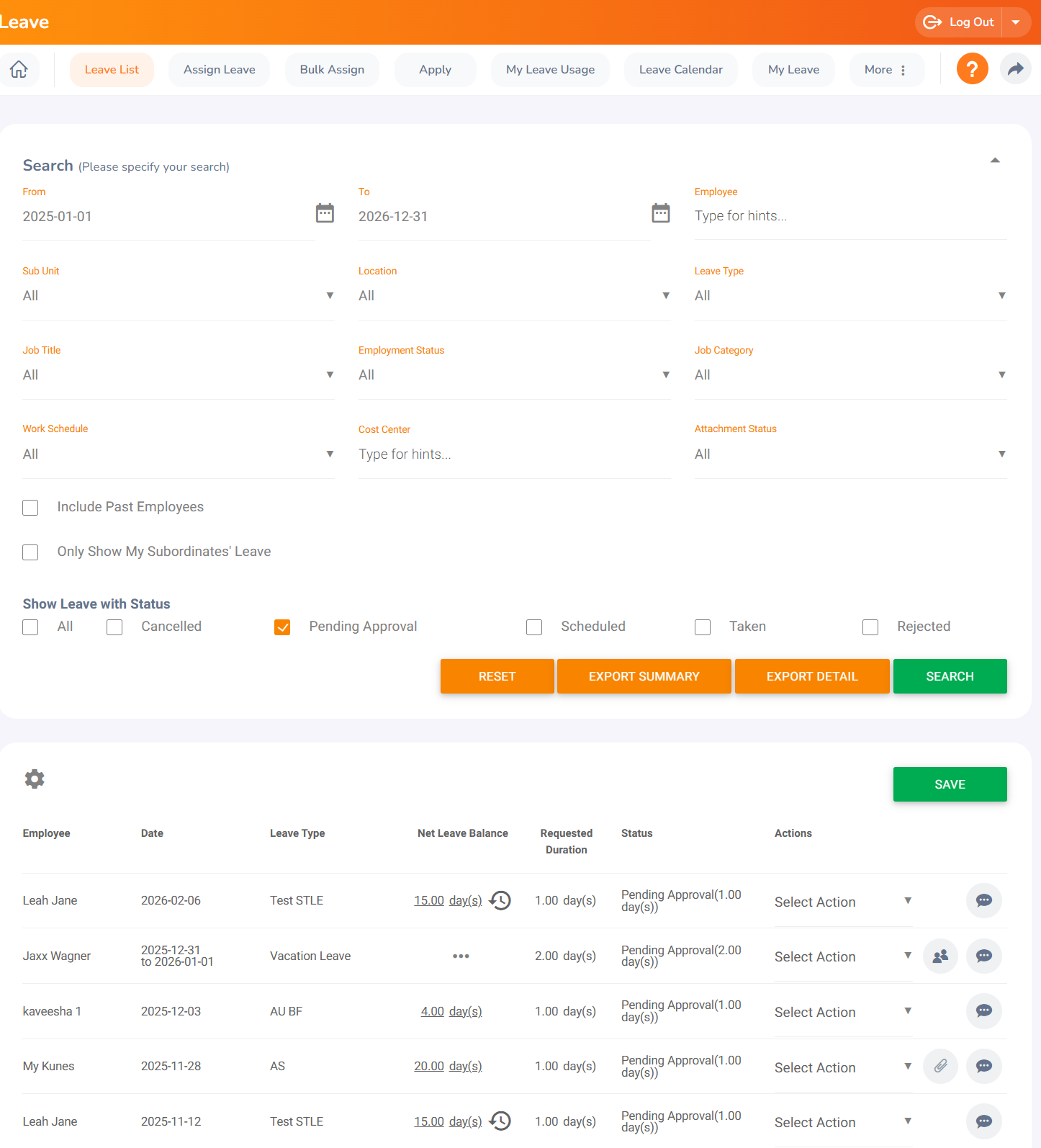 In this version, additional filters and some additional columns have been incorporated into the employee leave list. Now, it is possible to filter employee leave requests by the employee's job title, Employment status, subunit, employee location, job Category, and work shift. The leave list is configurable for up to 9 columns, and users can now see these new field options for leave requests of employees in the system.