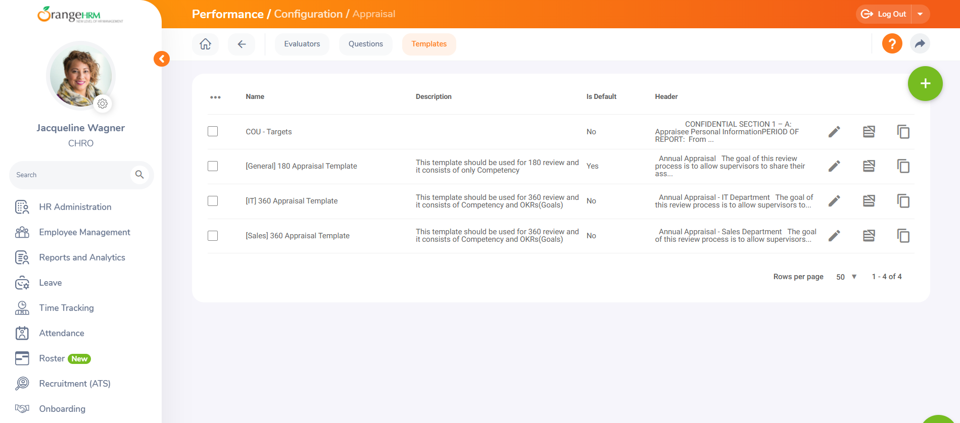 Go to Performance -> Configuration -> Appraisal -> Templates. This will bring you to the following screen: