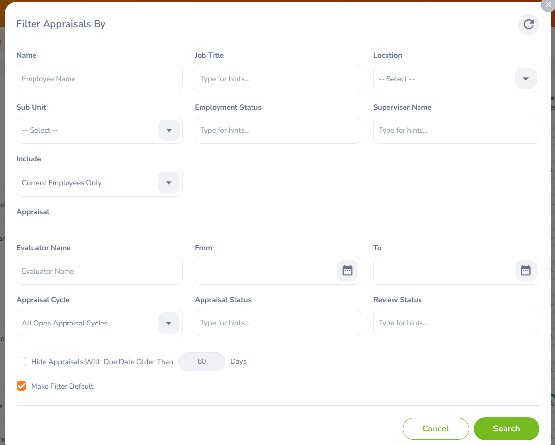 | Make Filter Default | Allows personalizing the appraisal list view based on specific user preferences. When saved, the same filters are applied automatically every time the user accesses the appraisal list. |