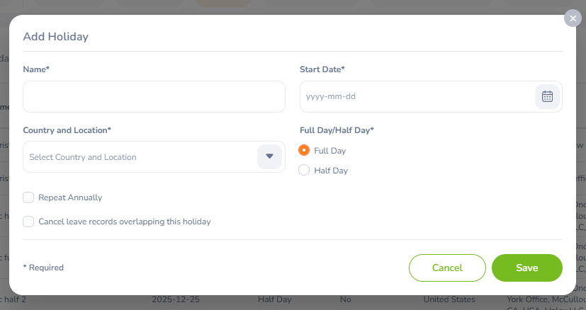If a holiday is added or updated (past, present, or future), the system automatically cancels overlapping leave entries. To enable this feature, check the box in front of Cancel leave records overlapping this holiday.