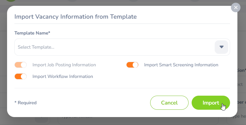 You can import vacancies using an already created template and select which details to import. The available options include: