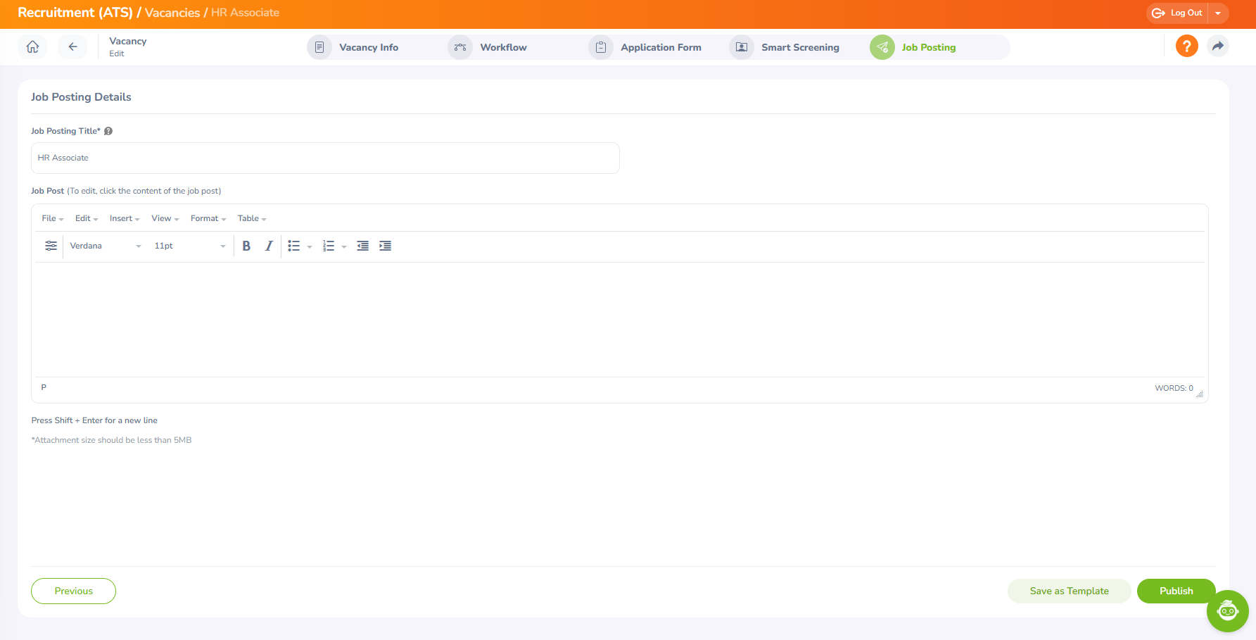 Step 13 - Finally, the "Job Posting" section will appear. Add a "Job Posting Title" and a description to "Job Post" using the editor. If you wish to publish, you can either publish the vacancy directly or save it as a template to use later.