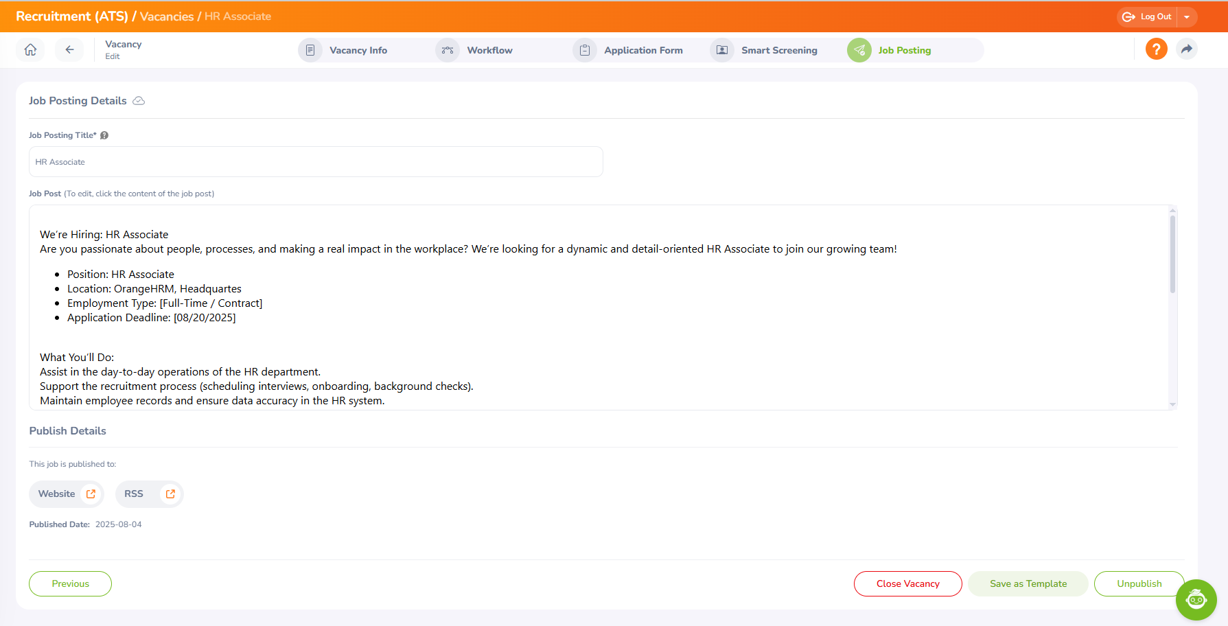 Step 14 - You can directly publish the vacancy to the website or through the RSS feed for broader visibility.