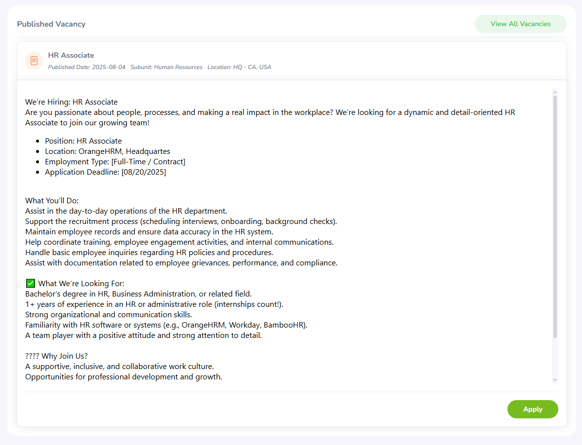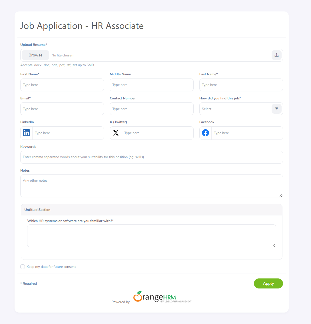 Step 15 - When a candidate clicks the Apply button, the application form you created will open for them to fill out and submit their details. This form includes all the sections and questions you have set up, allowing candidates to provide their personal information, answer required questions, and upload any necessary documents.