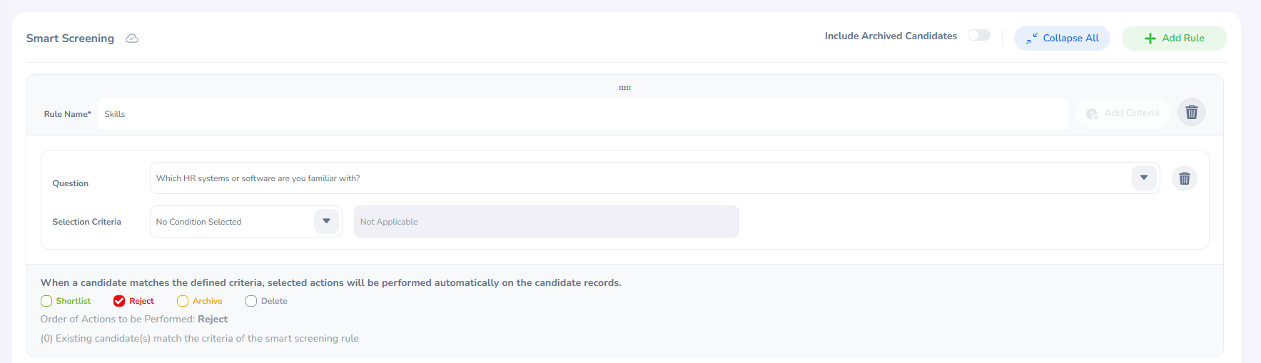 Enable "Include Archived Candidates" to specify whether archived applications should be included in the selection or filtering process