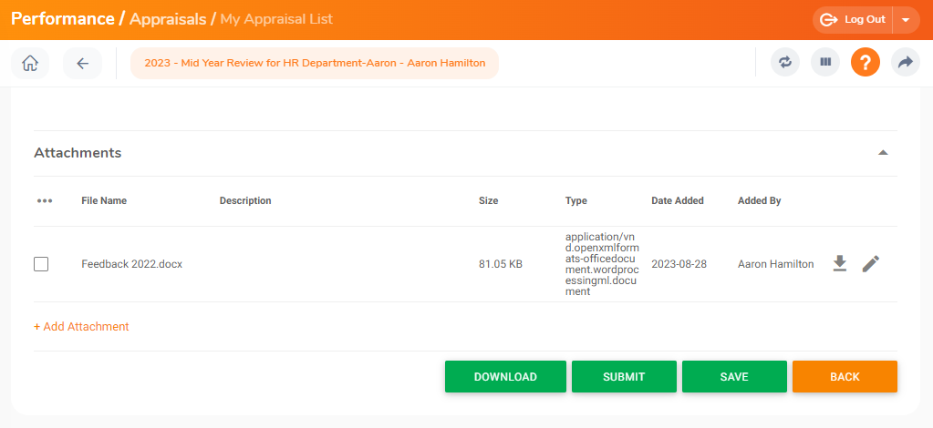 If the attachment section is enabled, the reviewers can upload attachments for the appraisals. Please refer to the following article to enable the attachment section.