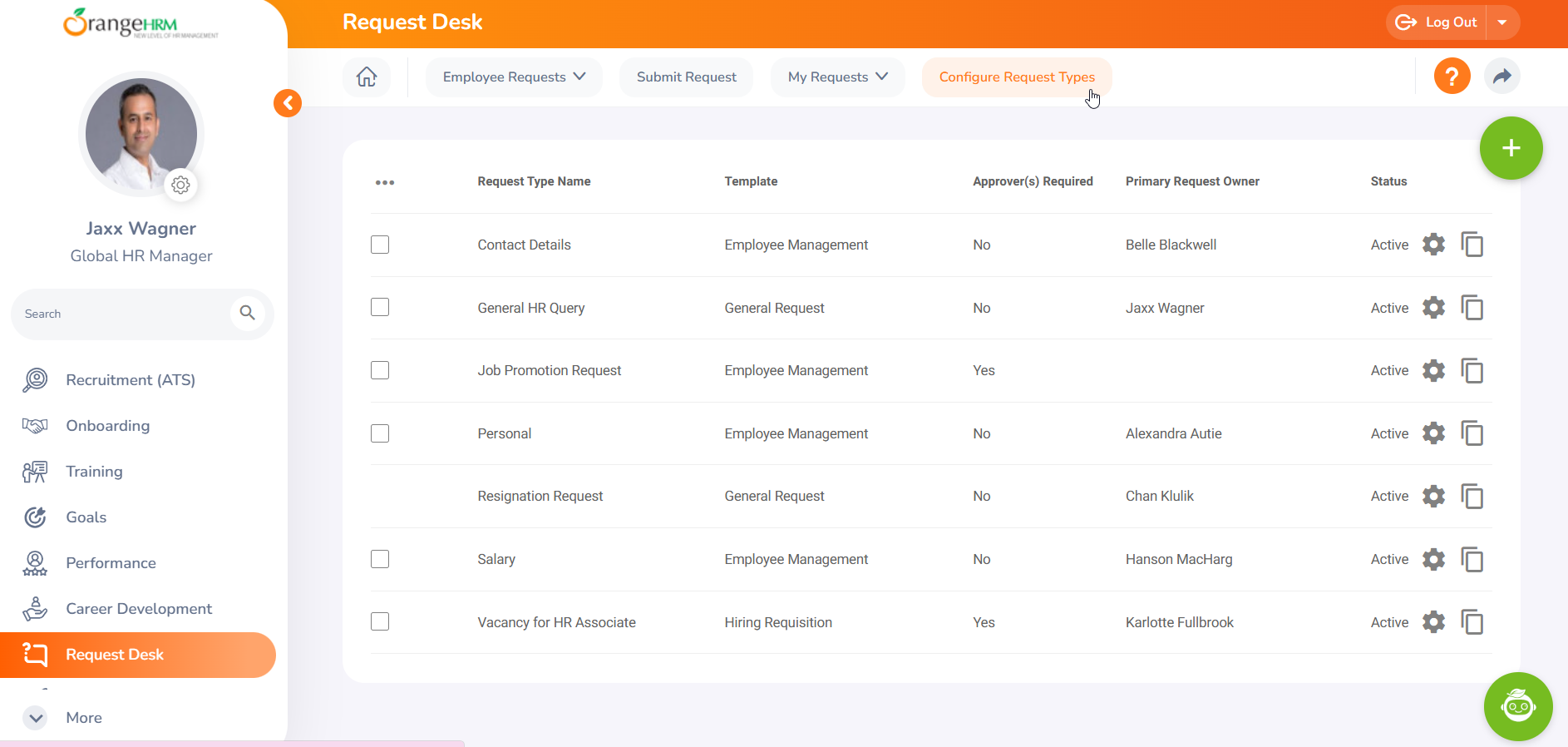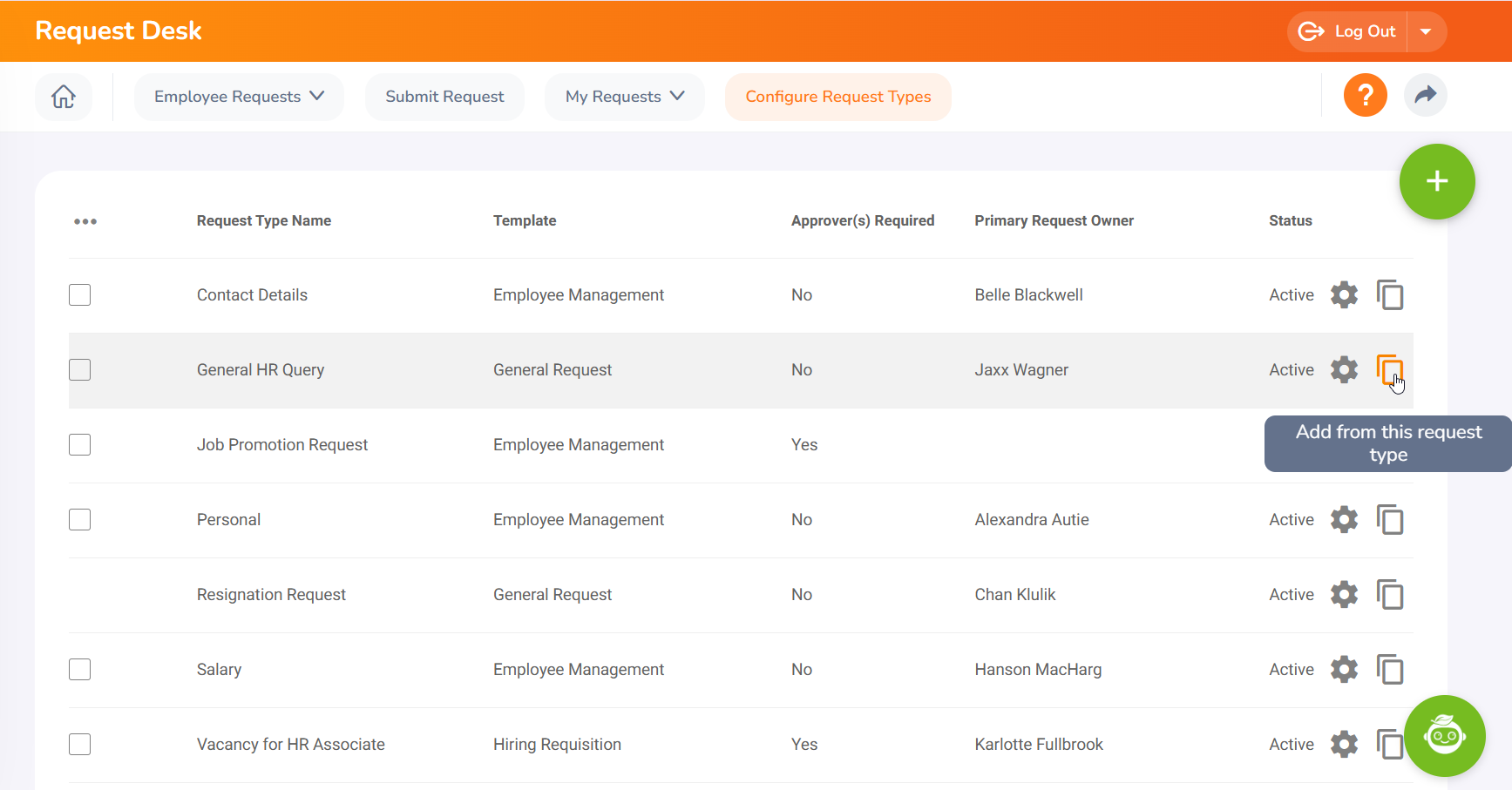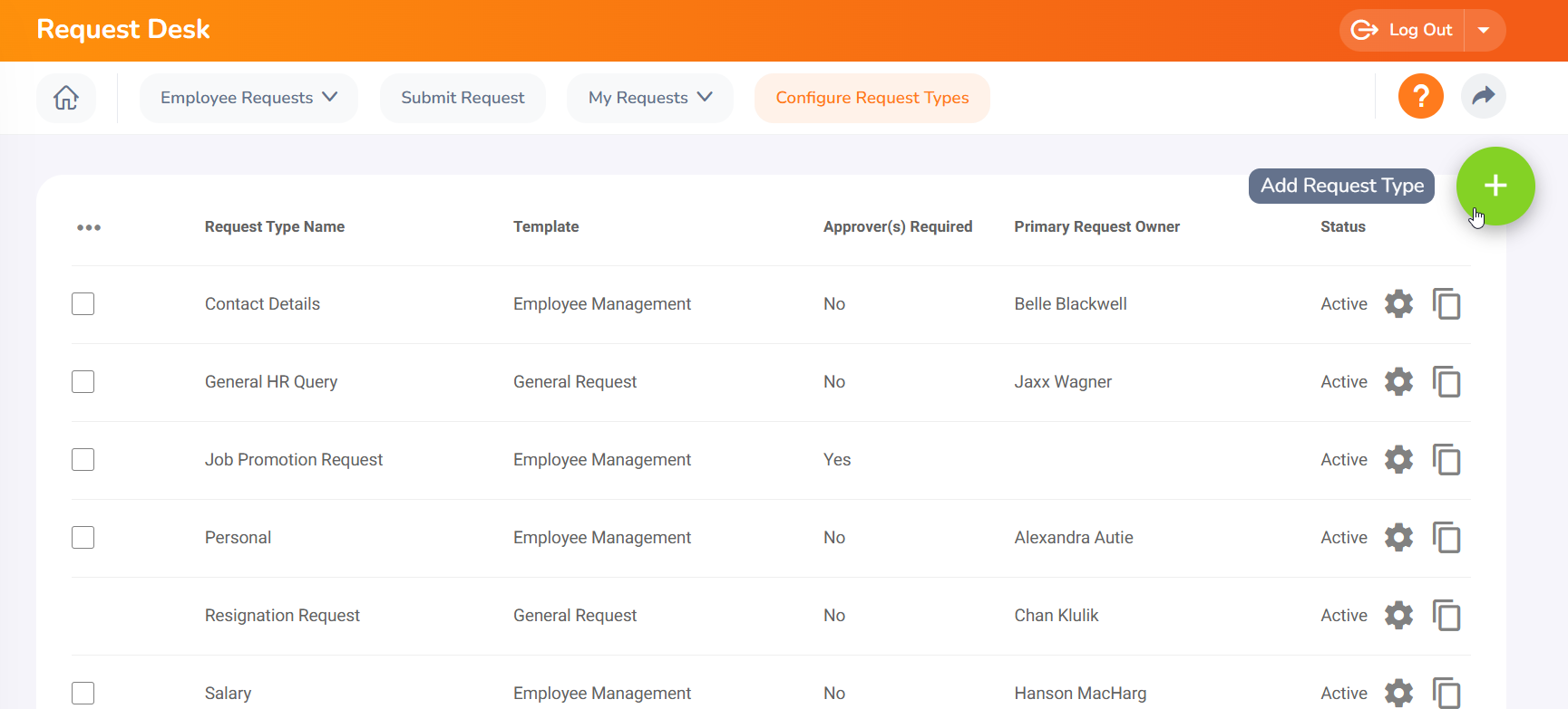 To quickly create a new request form, click the 'Copy' icon on an existing template. The system will duplicate all settings except for the Request Type Name, Primary Request Owner, and Secondary Request Owner, which you must define for the new form.