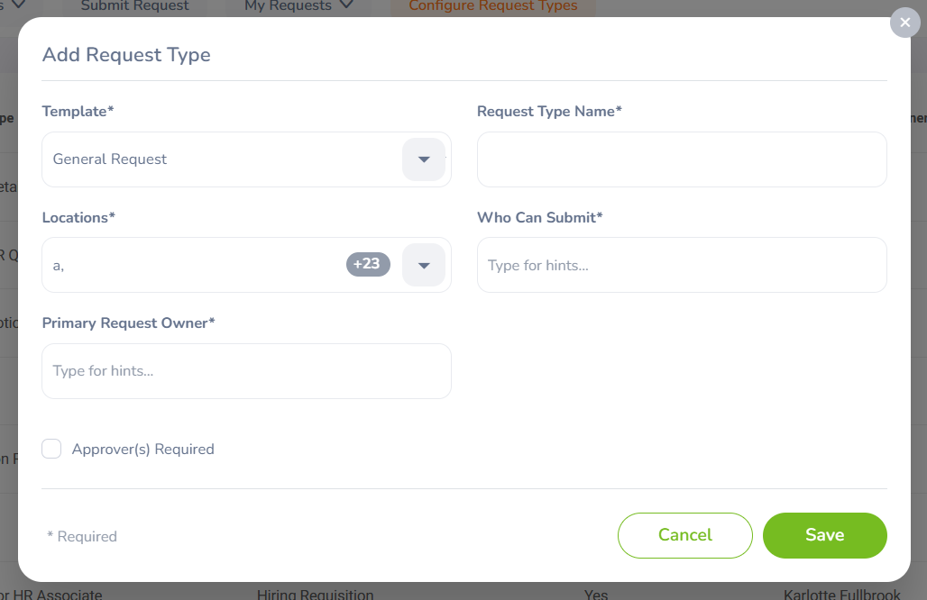 | Approver(s) Required | If the request type needs to be approved by a supervisor or any other employee before the request passes to the final receiver. |