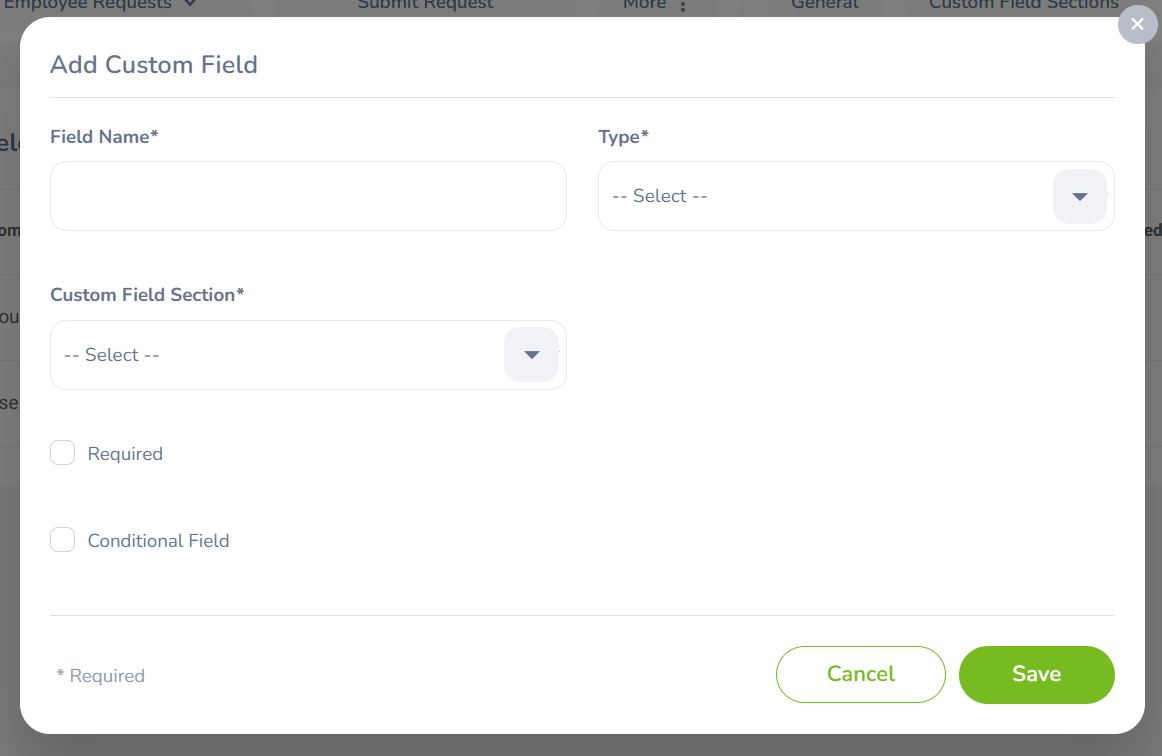 | Custom Field Section* | Click the dropdown and select which section of the request form this field should appear in. |