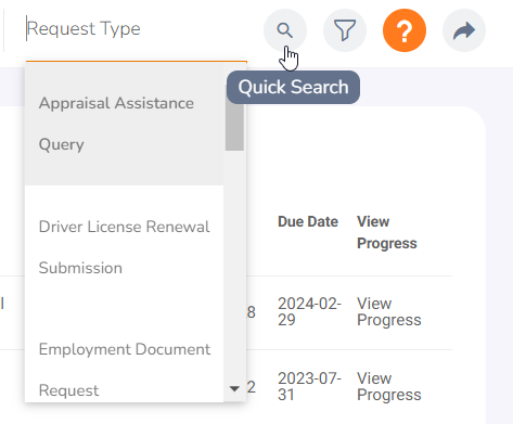 Primary Owner and Approvers can now easily filter request lists by request type using the Quick Search options, enhancing efficiency in managing requests.