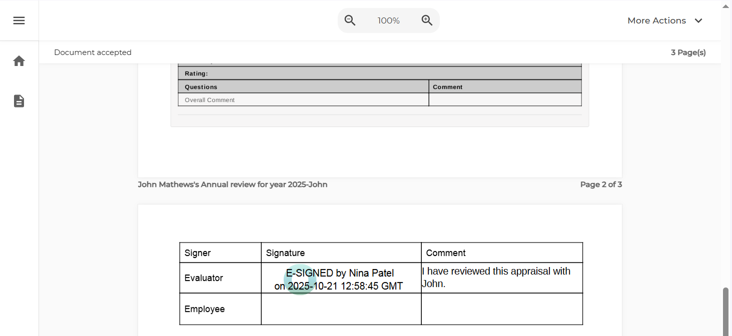 Once the main evaluator has completed the appraisal and submitted it, the system will notify him/her to e-sign the appraisal. The system enables the e-sign option in a single and multiple appraisal views for the main evaluator. Upon selection of the E-sign option, the system will create a PDF file with the main evaluator’s appraisal, and the document will be uploaded to the e-signature provider’s system.