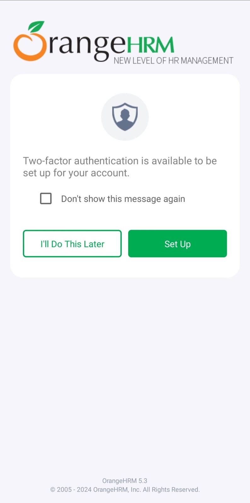 Step 2: After logging in, the screen prompts the user to set up Multi-Factor Authentication. The user can choose one of two options: "Set up" or "I'll do this later," and then tick "Do not show this message again" only if necessary.