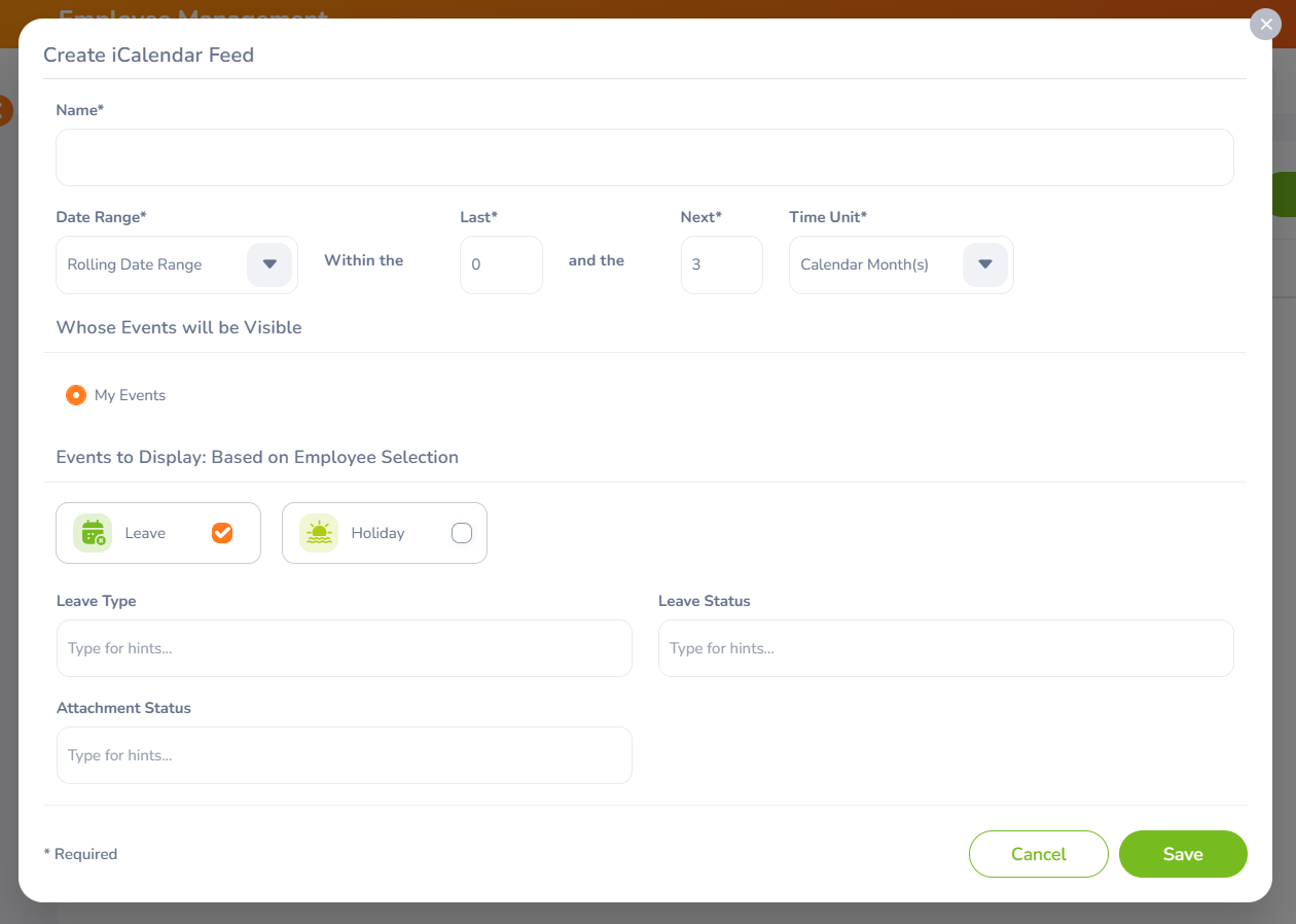 *Fields marked with an asterisk (*) are "required fields" and must be filled in to successfully create an iCalendar feed.After filling in the necessary details, click "Save" to generate your iCalendar feed. You can then integrate it with your preferred calendar application (Google Calendar, Outlook, Apple Calendar, etc.).