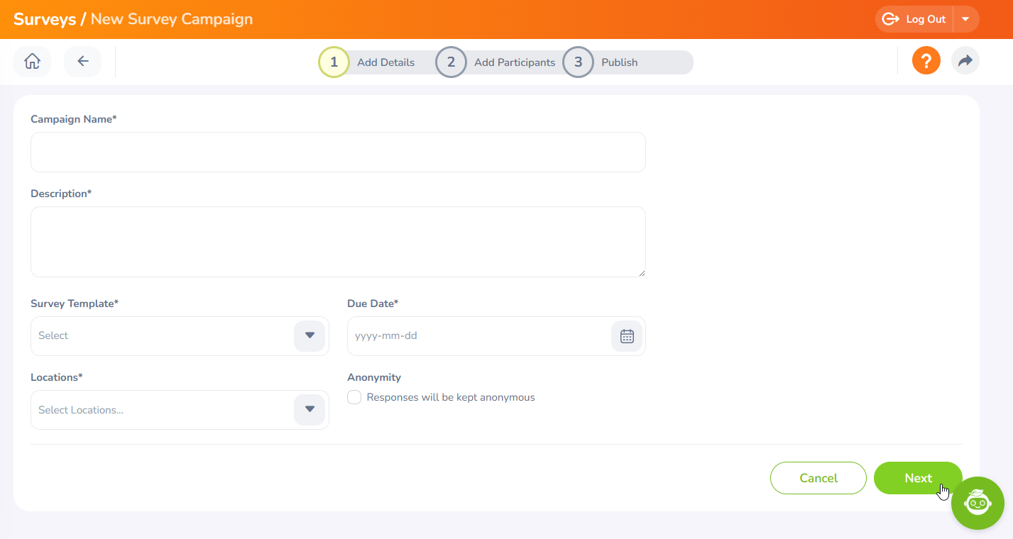 This article outlines the steps to create a survey campaign using a survey template previously created by the user in the system.