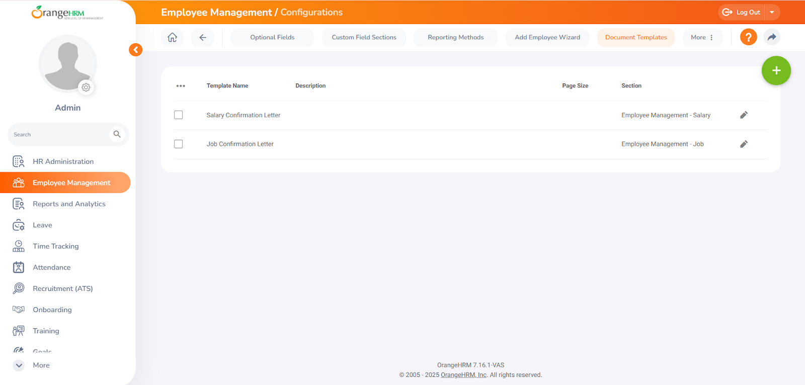 Standard HR document templates, such as Job Confirmation and Salary Confirmation letters, are now available within the system. These templates come pre-filled with sample content and token placeholders, allowing HR teams to generate employee documents more quickly and with minimal setup. This enhancement streamlines documentation processes and ensures consistent formatting and language across all generated documents.