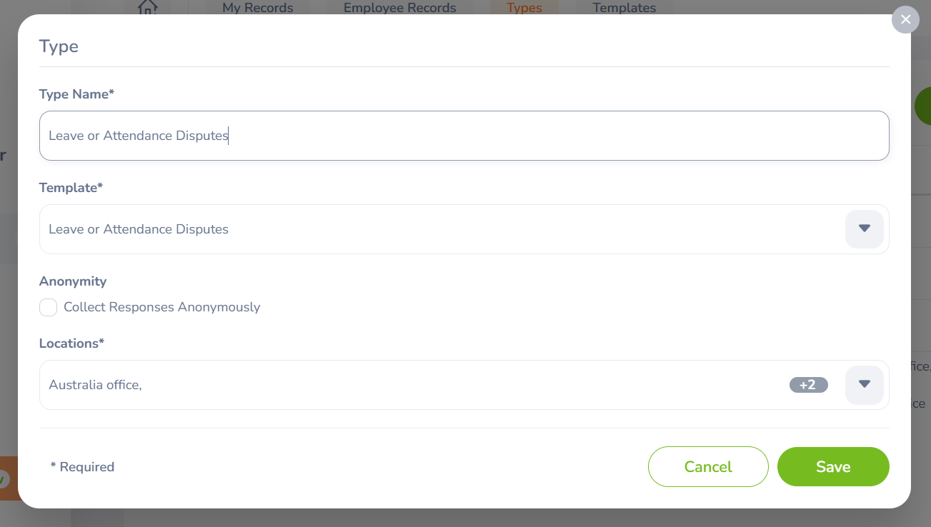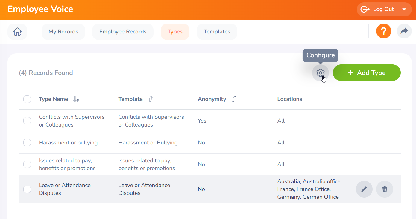 (Note: These are pre-defined Employee Voice types in the system. Users do not have permission to edit them.)