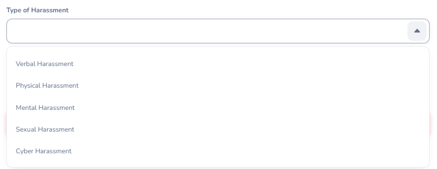 | Type of Harassment | Click the dropdown menu and select an option from the list. |