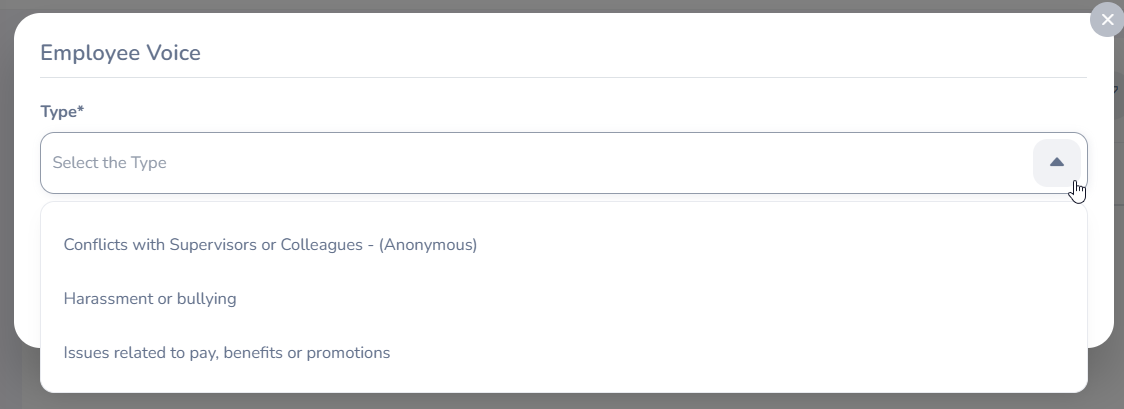 | Type | Click on the dropdown and select an Employee Voice Type from the list below. |