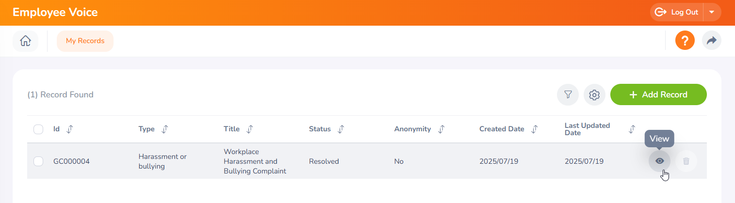 Step 05 - Once you submit the Employee Voice Form, it will appear under the "My Records" for your reference. You can view the current status of your Employee Record under the "Status" column to track its progress.