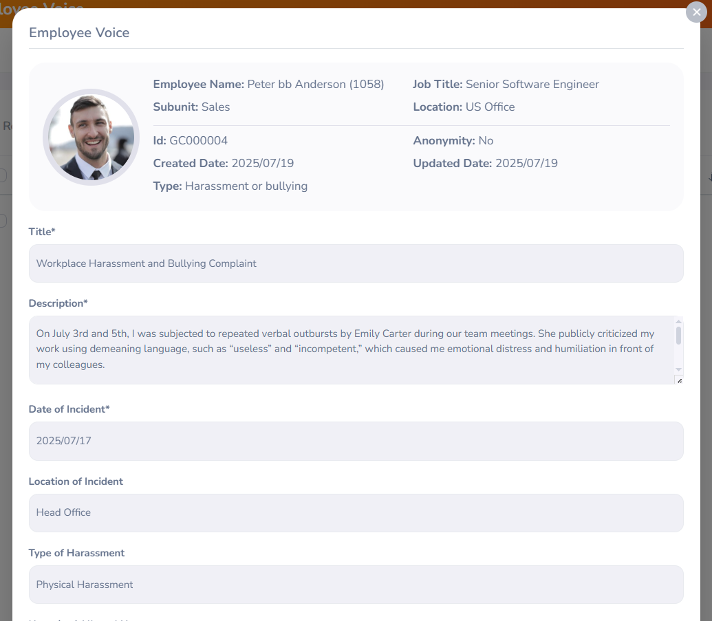 | Location of Incident | Mention where the incident took place (e.g., office location, department, remote setting). |
