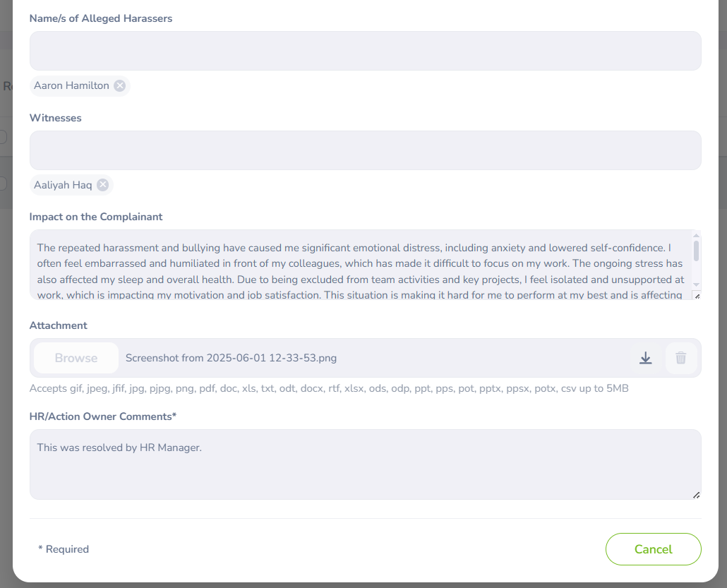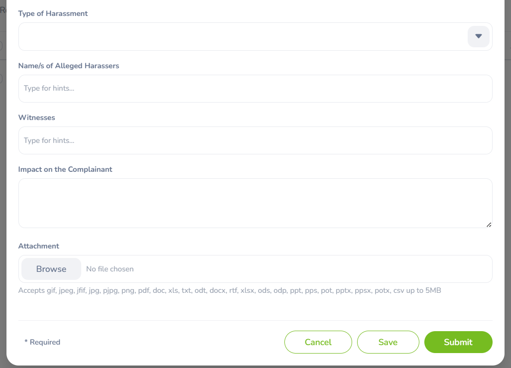 | Attachment | Upload any supporting documents, such as screenshots, emails, or other evidence related to the grievance. |
