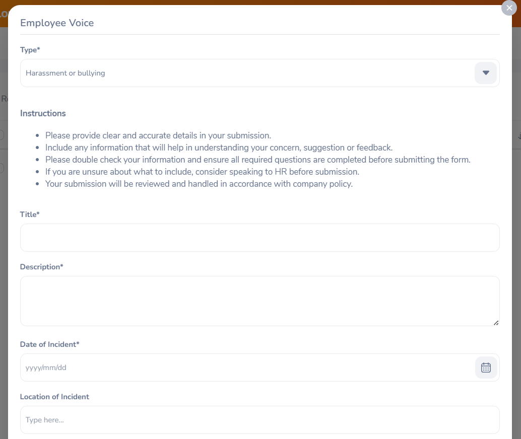 Note: The fields in the Employee Voice Form will change based on the Employee Voice Type you select.