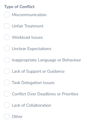 | Involved Party/ Parties | Select the involved parties: Supervisor, Colleague, or Both. |