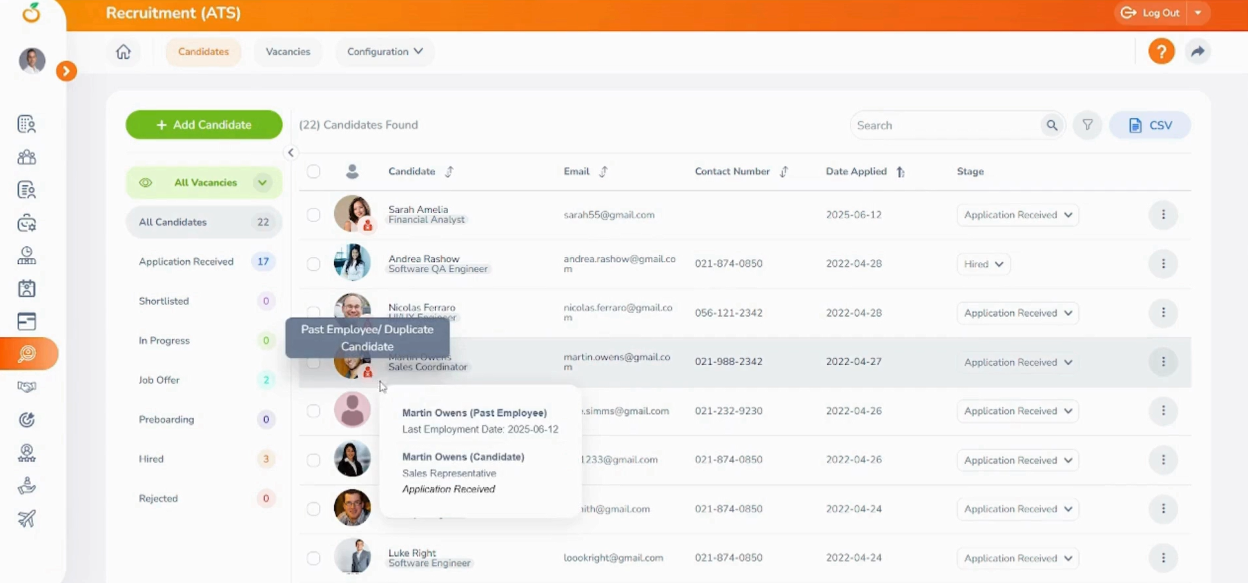 Step 04 - When you click on the flag icon in front of Martin Owens, you can identify that he is both a past employee and a duplicate candidate. Additionally, you can view the position he applied for, the current recruitment stage he is in, and his last employment date.