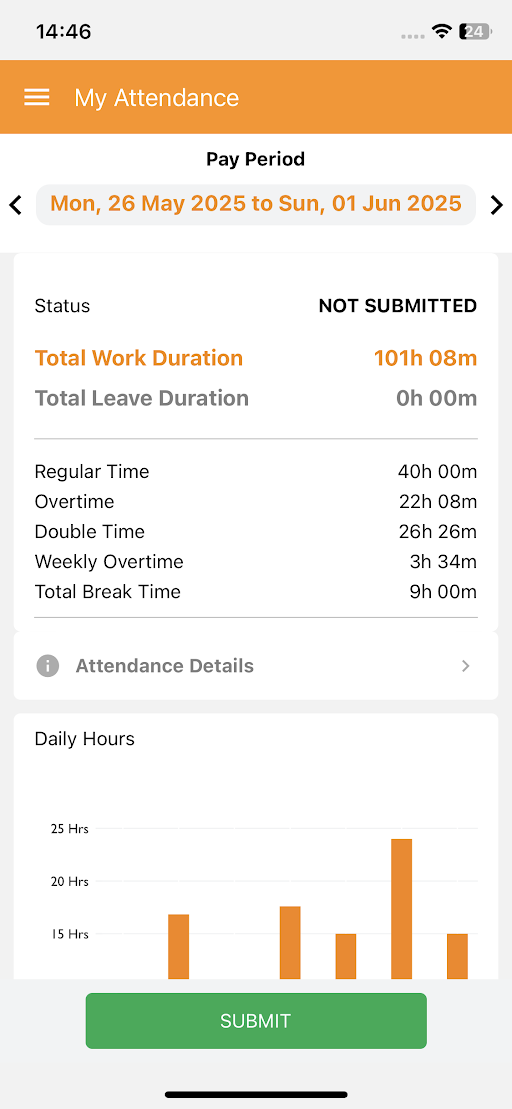 Daily Hours Chart to display daily attendance duration for the entire Pay Period (Weekly, Bi-Weekly, or Monthly)