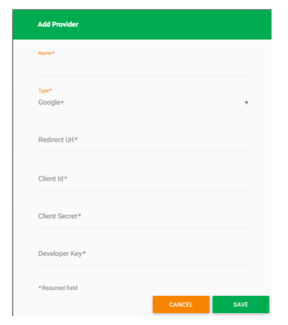 • Press Add Provider to create a new Authentication provider. Google+ to be selected, and the below information to be added.
