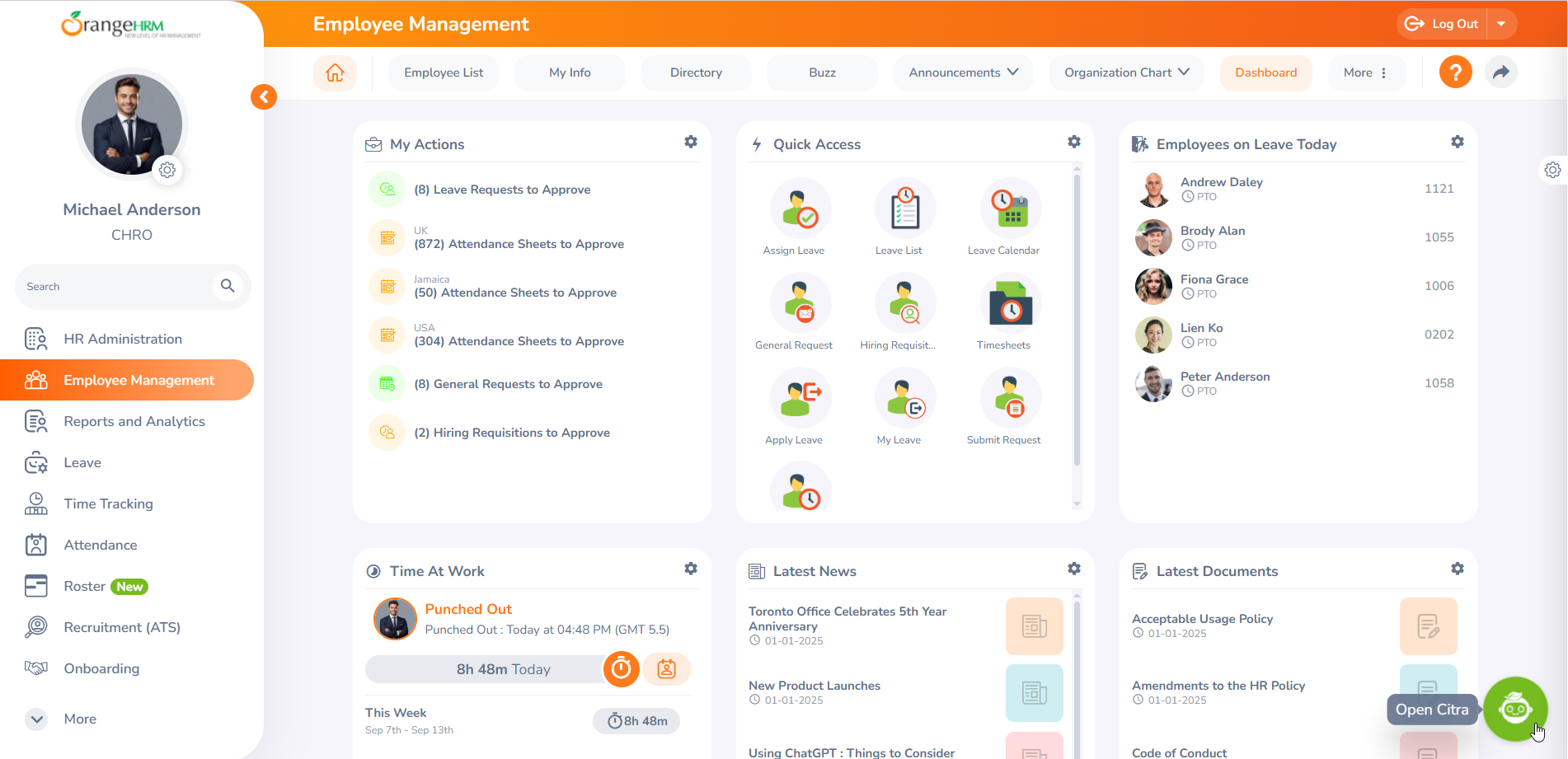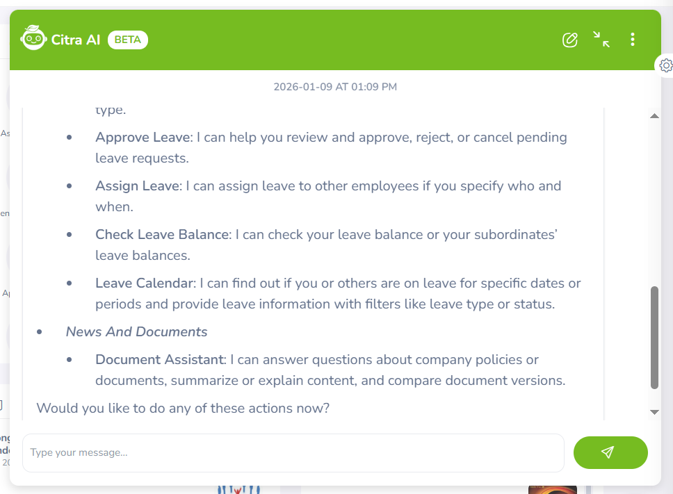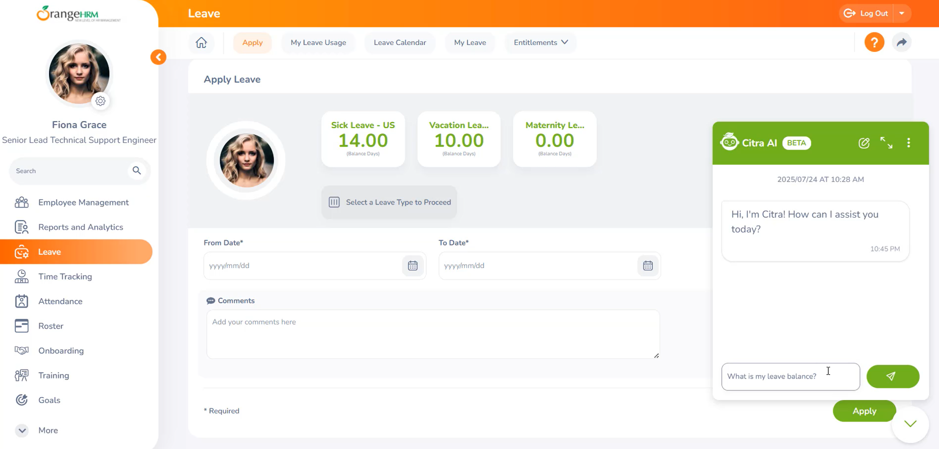 Citra AI is OrangeHRM’s intelligent chat assistant designed to simplify everyday HR tasks. Instead of navigating through multiple menus, employees and managers can interact conversationally with Citra to perform actions such as checking leave balances, applying for leave, viewing employee information, and even generating surveys.