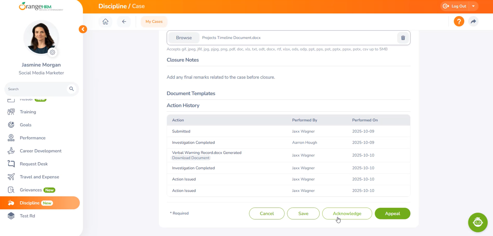 Employees can choose to acknowledge the case to confirm they have received and understood the disciplinary action.