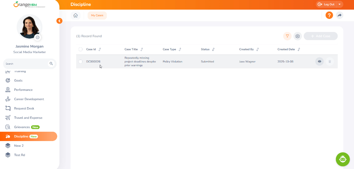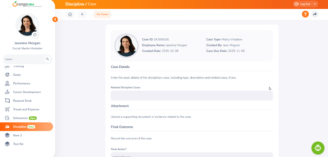 The Discipline Module in OrangeHRM is designed to ensure transparency and streamline communication between employees and HR teams regarding disciplinary matters. Through the module, employees can not only view the case but also actively participate in the process by providing their comments, submitting supporting documentation, and indicating their acknowledgment or appeal of the action taken. The system provides a secure and organized way for employees to interact with disciplinary cases, ensuring that they have a clear understanding of the situation while maintaining proper record-keeping.