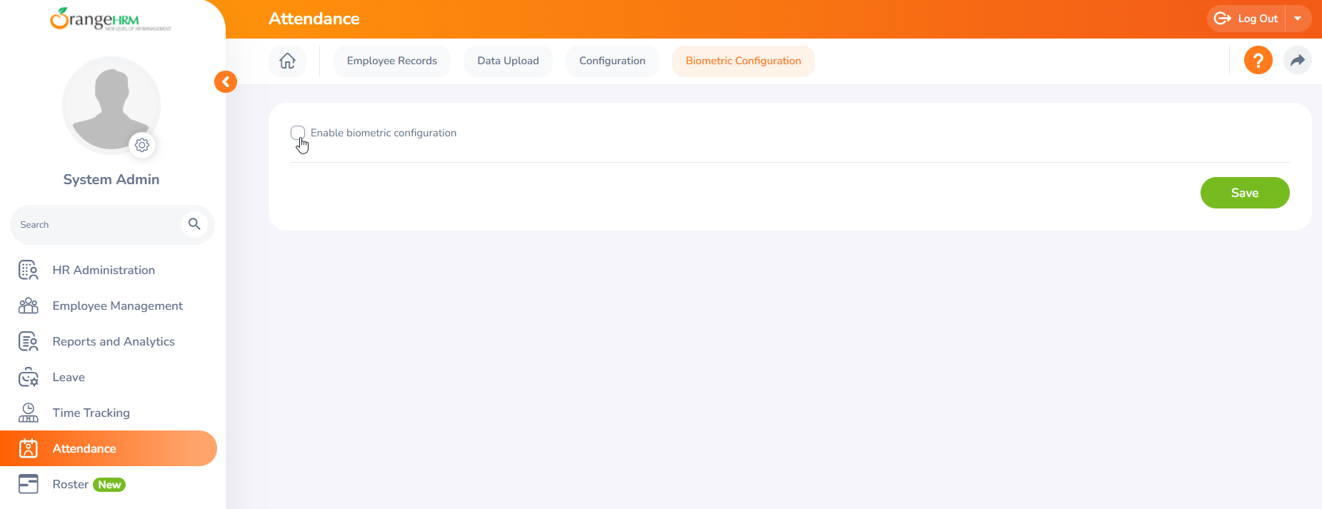 Step 01 - Navigate to the "Attendance Module", then go to Biometric Configuration. Enable the Biometric Configuration by checking the box.