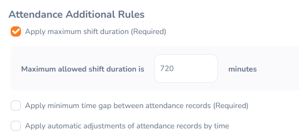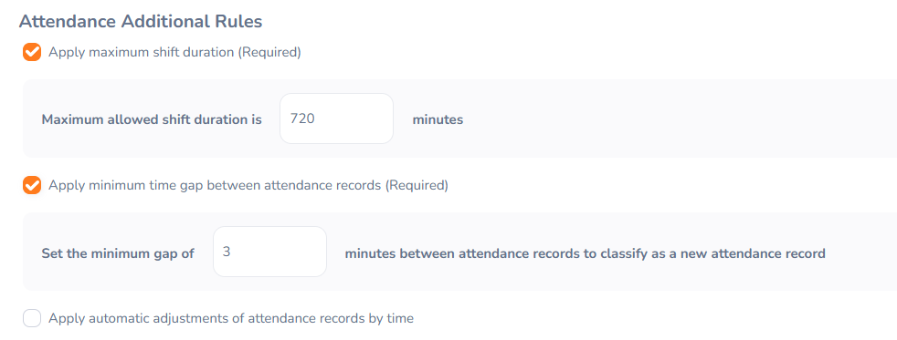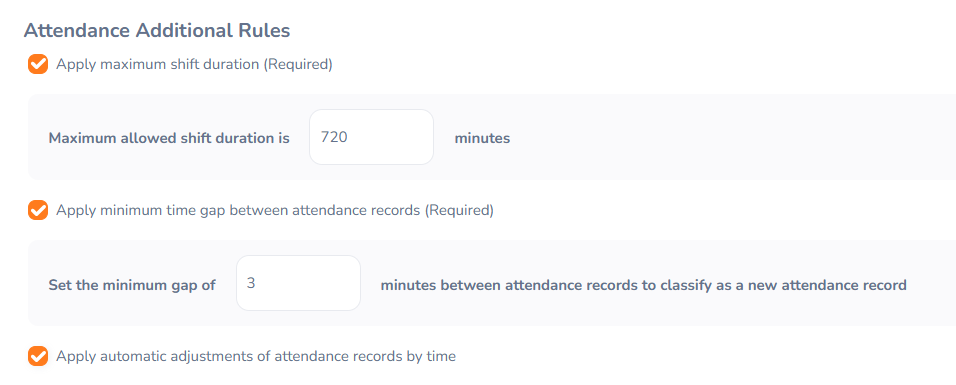 - Apply minimum time gap between attendance records (Required)