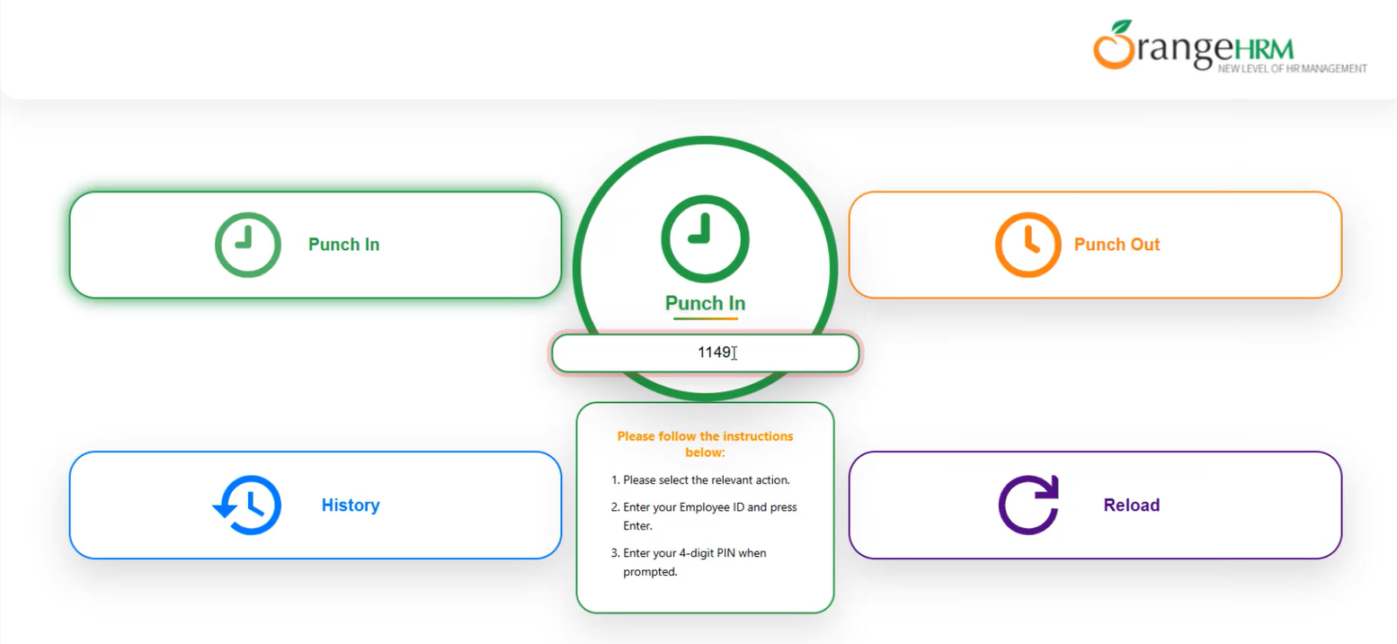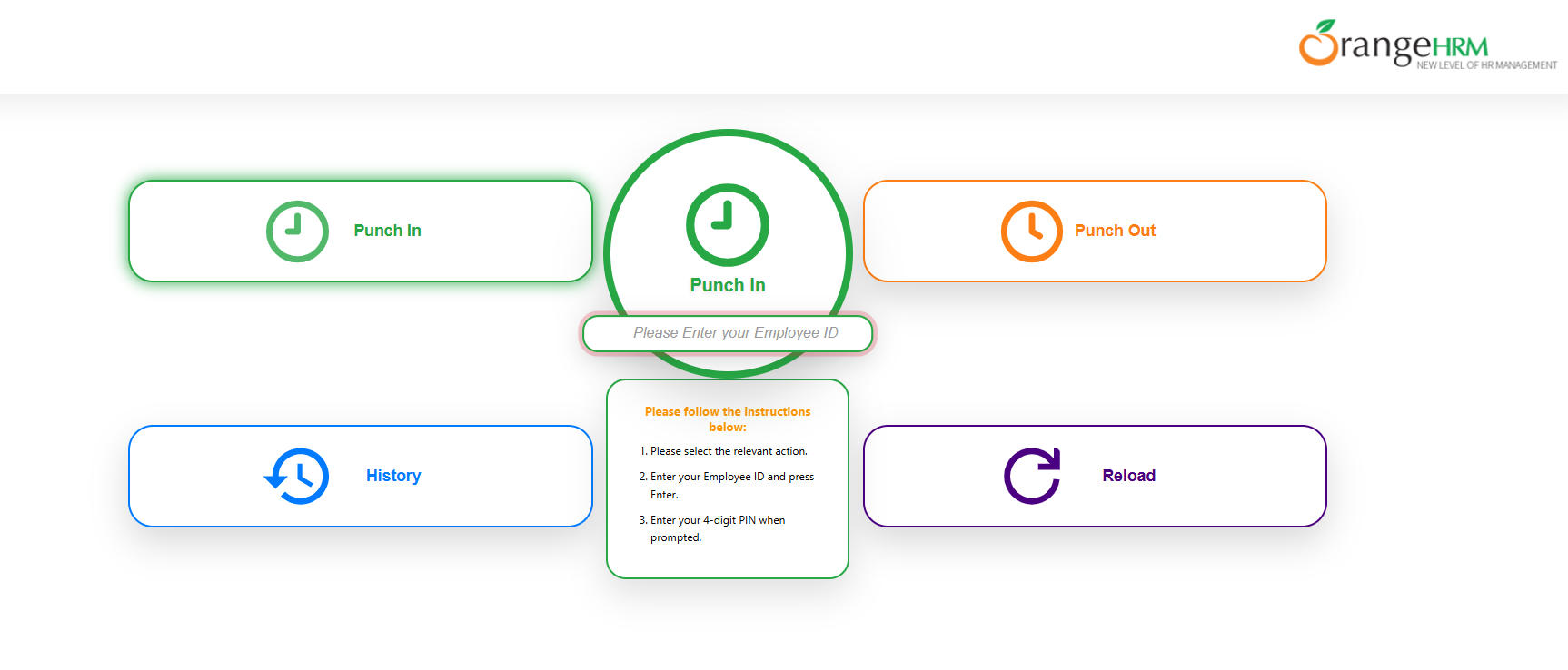 The OrangeHRM Timeclock is a lightweight, standalone solution designed as a cost-effective alternative to biometric devices for tracking employee attendance. This allows employees to perform essential punch actions - Punch In, Punch Out, and view their Attendance History - through a simple, intuitive interface that syncs seamlessly with OrangeHRM's Attendance Module.