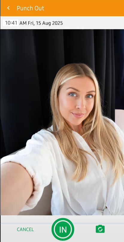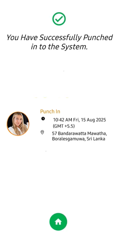 Step 3 - The application displays the confirmation message below. You’ll see the date and time you punched in, along with your location and the captured selfie.