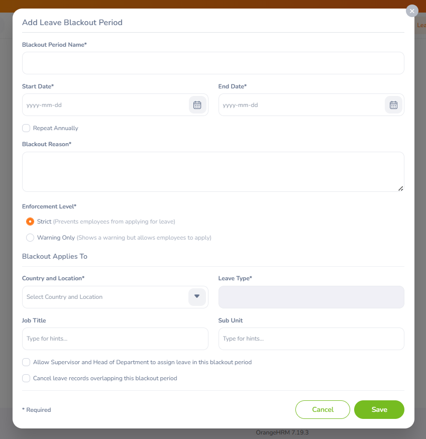 | Start Date* | The date when the blackout period begins. Leave requests will be restricted or warned against from this date. |