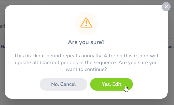 If the blackout period is set to repeat annually, a confirmation dialog will appear.