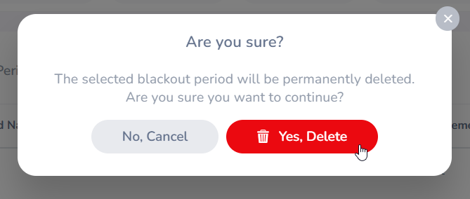 A confirmation dialog will appear, warning you: "The selected blackout period will be permanently deleted. Are you sure you want to continue?" To proceed, click "Yes, Delete."