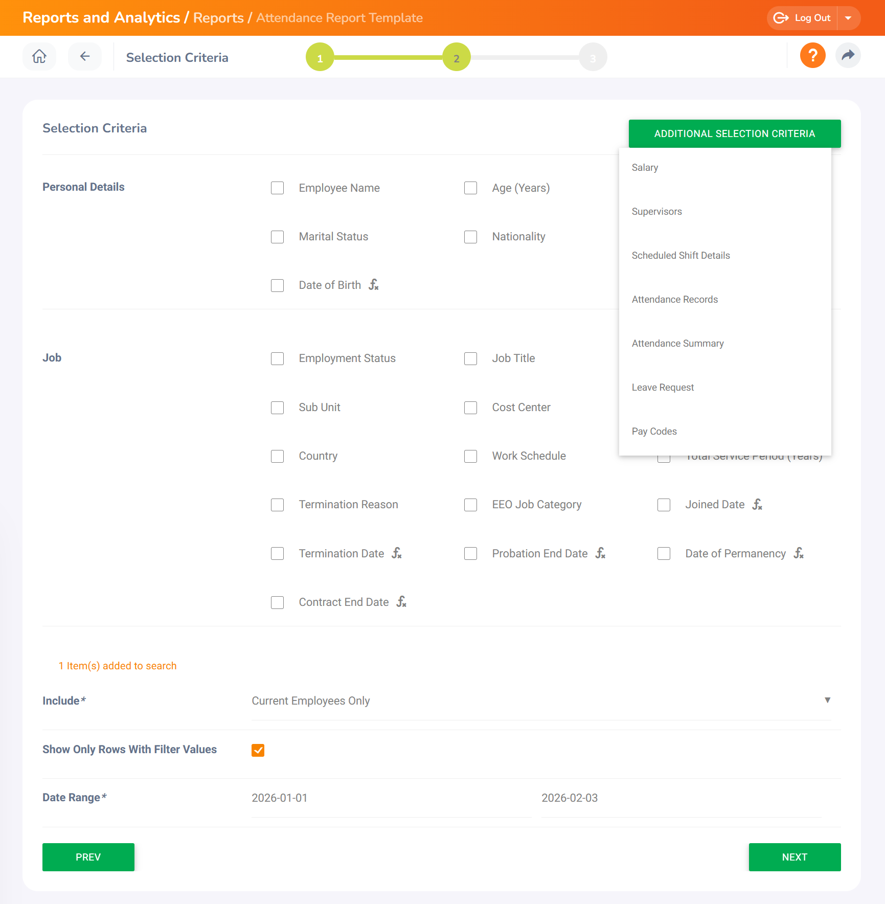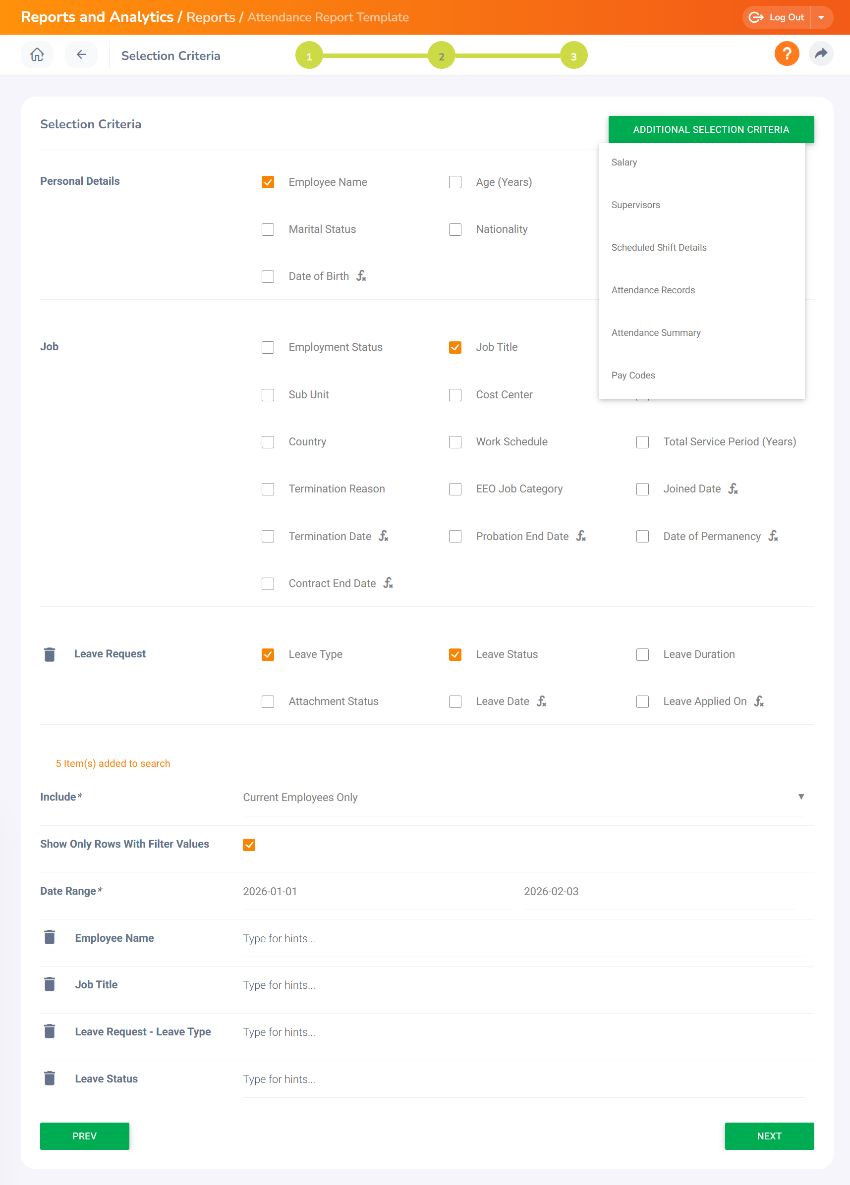 Selection Criteria* - From the list of available categories under Additional Selection Criteria, select the categories you want to add. The data fields related to the selected categories will then be displayed.