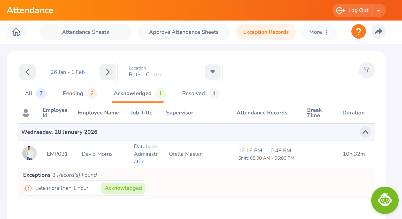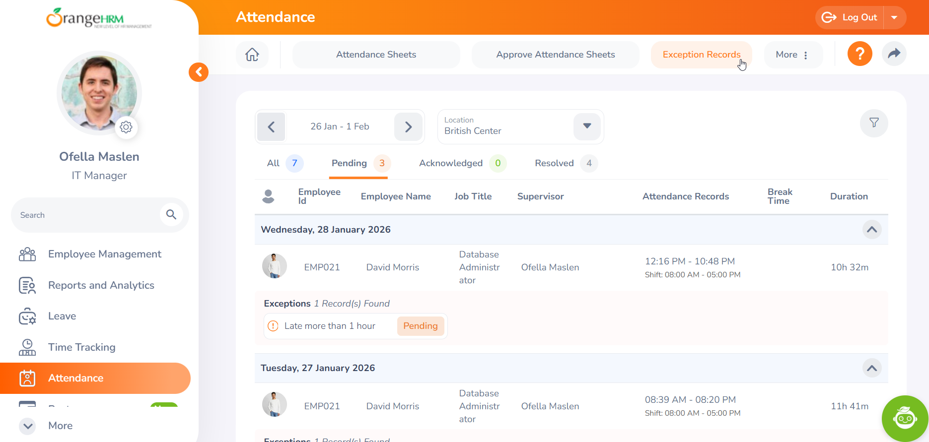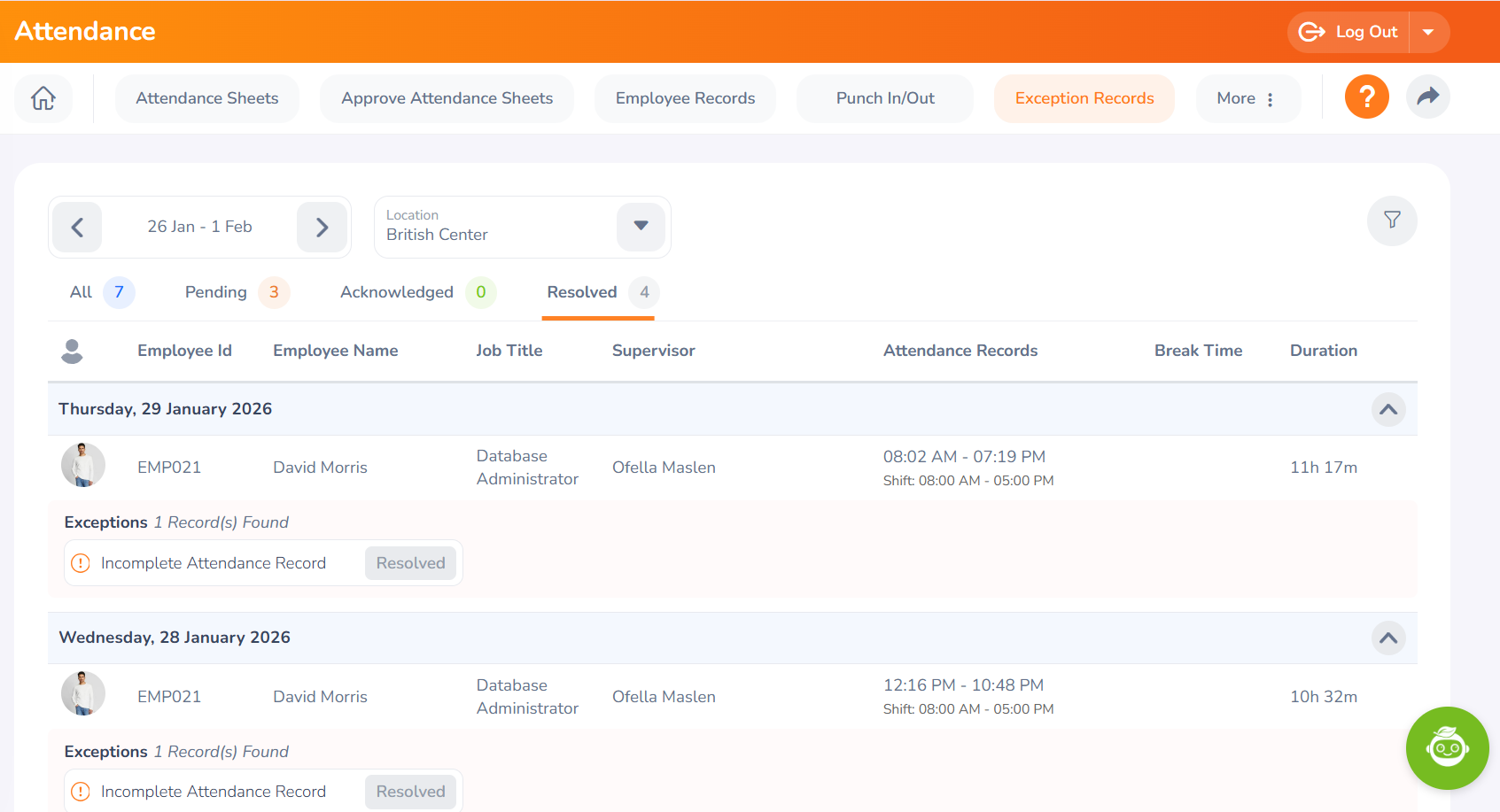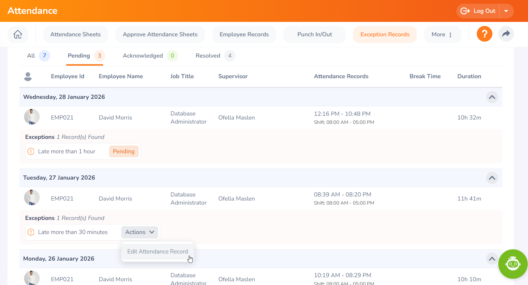 Step 01 - Navigate to the Attendance module and go to the "Exception Records" section.